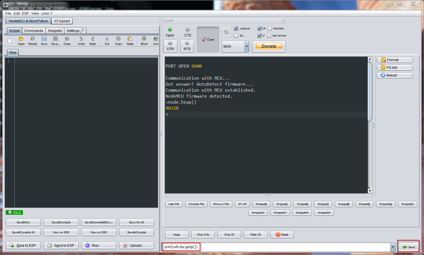 Salviamo il file come ipstatico.lua. Con ESPlorer carichiamo il file sul nodemcu devkit con il pulsante “Save to ESP”.
