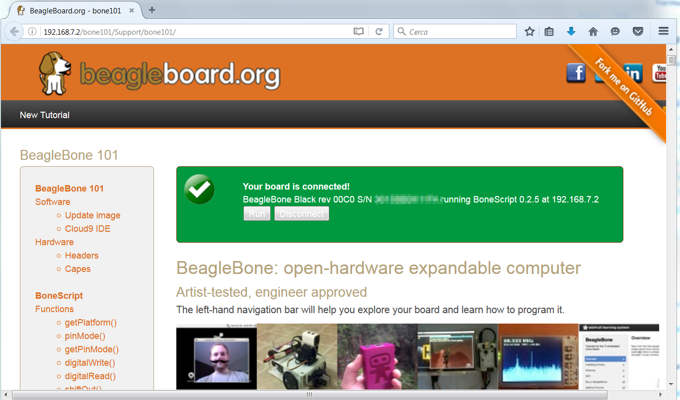 Disco rimovibile BeagleboneEseguendo start.htm si avvia una interfaccia analoga a quanto presente sul sito web getting-started