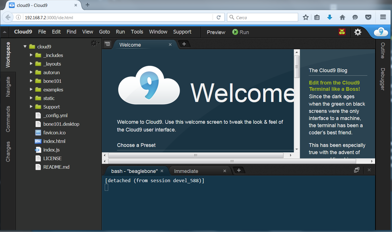 Cloud9Nei nostri esempi non modificheremo il sistema operativo presente sulla scheda eMMC interna, ma scaricheremo una versione aggiornata di Debian per Beaglebone e lo installeremo su una scheda micro sd. Il sistema può essere chiuso con il pulsante Power presente sulla scheda