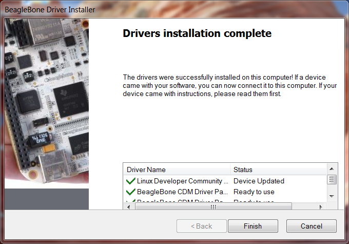 BeagleBone Driver InstallerAl termine viene mostrata la finestra con le operazioni eseguite