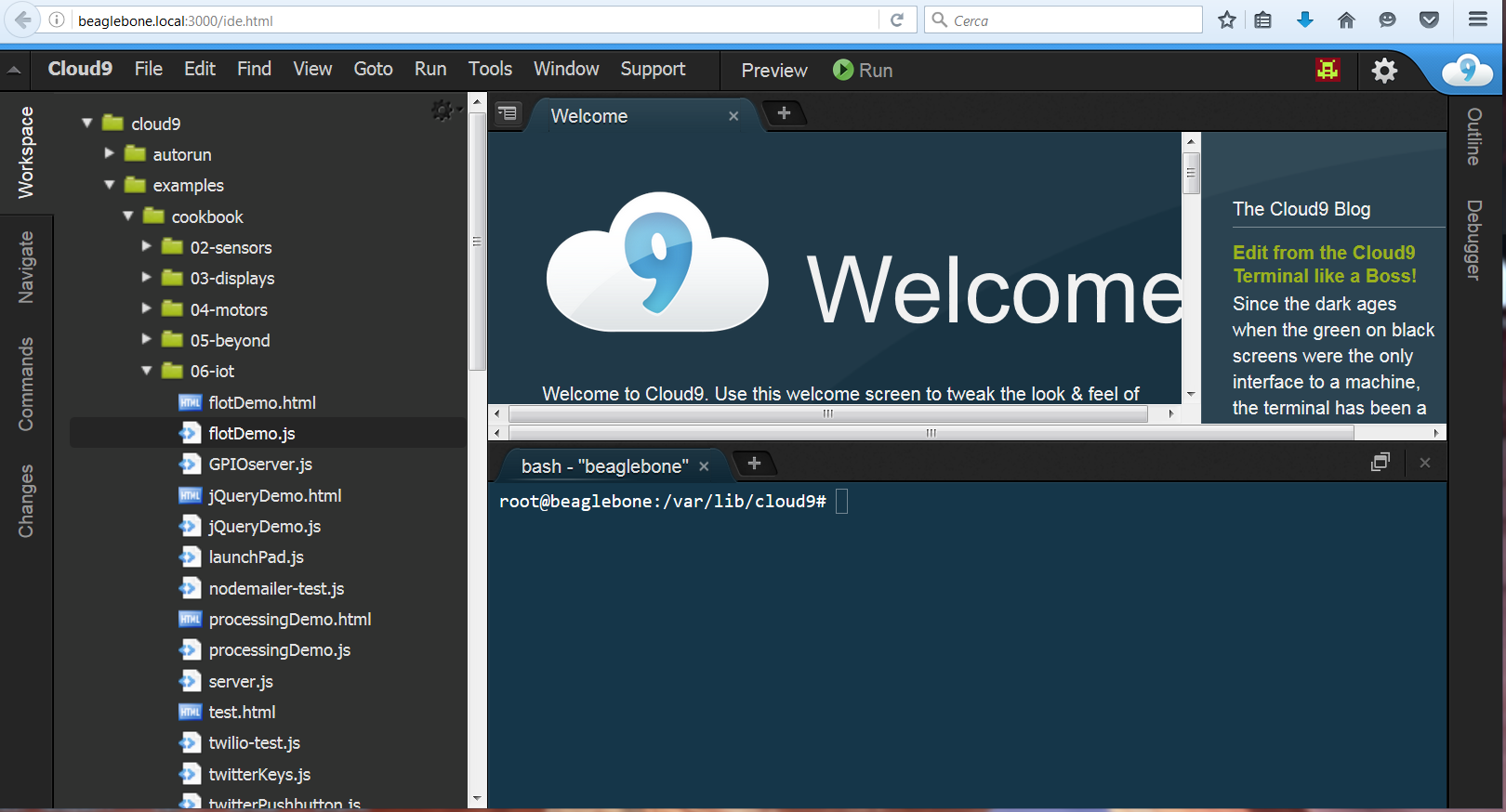 Cliccando su Cloud9 viene mostrata la sezione nella pagina dedicata a tale strumento. In tale sezione viene indicato come creare un semplice esempio ed farlo partire all’avvio della scheda piazzandolo nella cartella autorun presente nella interfaccia dell’ide. Da tale sezione si accede all’ide vero e proprio presente sulla porta 3000 del sito in funzione sul Beaglebone