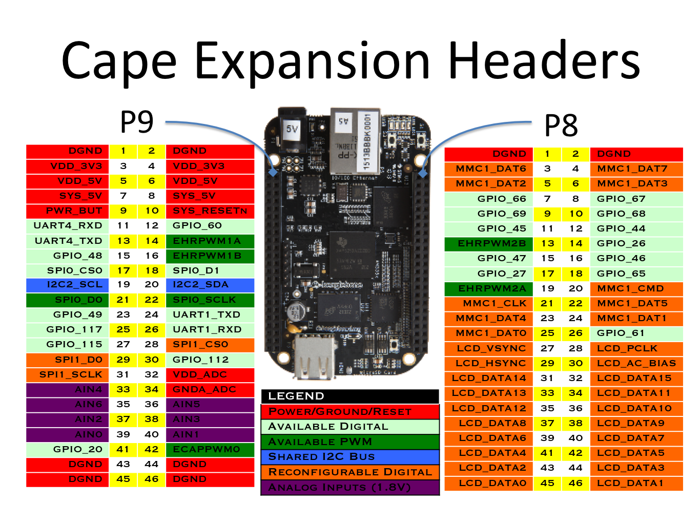 Nella pagina iniziale dell’interfaccia web del Beaglebone, http://beaglebone.local, sono indicati tutti i pin disponibili e la loro funzione. Di seguito viene riportata solo l’immagine con gli header di espansione