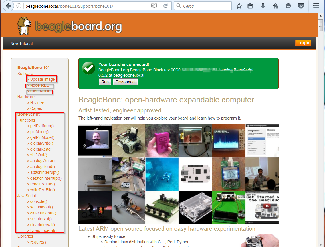 Si possono eseguire questi semplici esempi per incominciare ad interagire con la scheda. Sono presenti anche i link agli strumenti di sviluppo Cloud9 e Nodered e le informazioni su tali tools