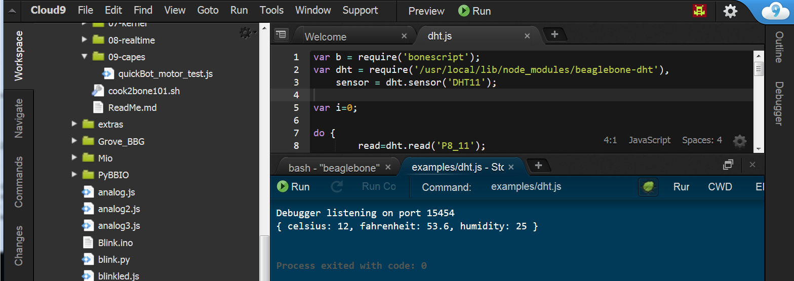 risultato lettura sensoreLo stesso codice può essere eseguito dall’IDE Cloud9. Accedere all’ide Cloud9 sul Beaglebone con il link http://beaglebone.local:3000 e creare un file dht.js con il seguente codice all’interno