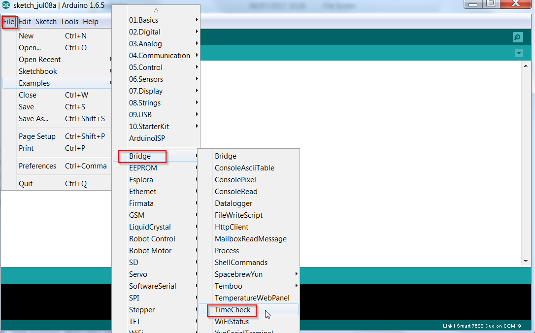 Al riavvio accedere sull’Ide Arduino e scegliere File->Examples->Bridge->TimeCheck