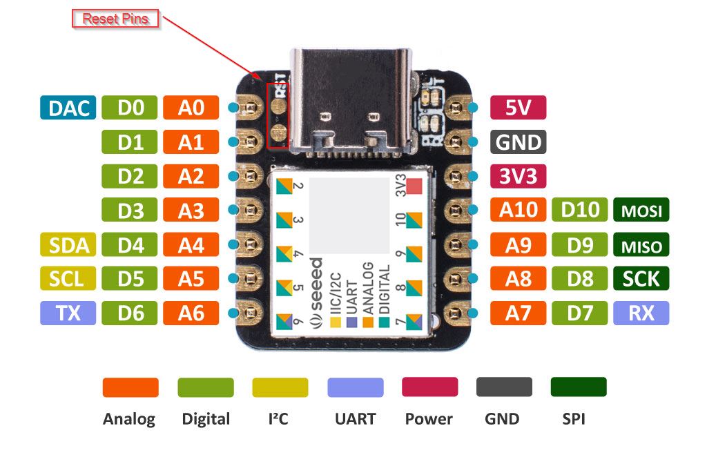 Seeeduino-XIAO-resetPer eseguire il reset o caricare altro bootloader collegare la scheda tramite USB Type C e  resettare  cortocircuitando velocemente i pin di reset. Quando il led arancione incomicia a illuminarsi con sfarfallio la scheda è pronta per caricare il firmware. Usare questo metodo anche nel caso in cui la scheda non risulti più visibile sulla porta USB del PC.