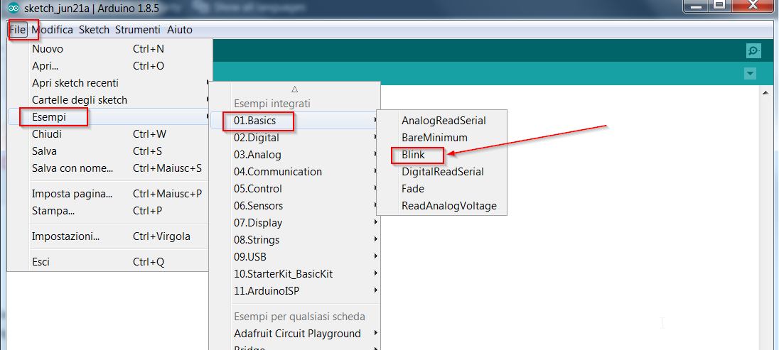 xiasetttings-itPer controllare che tutto l’ambiente è installato correttamente si esegue l’esempio di prova Blink di Arduino, accedibile in File->Esempi->01.Basics->Blink