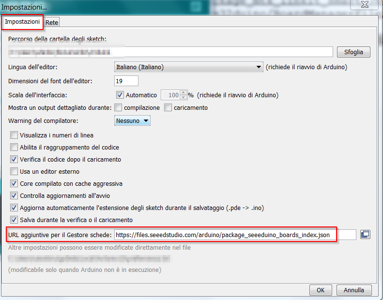 Dopo aver scaricato l’IDE lo si avvia e si aggiunge il repository delle schede di Seeeduino XIAO accedendo a File->Impostazioni. Nel tab “Impostazioni” individuare il campo “URL Aggiuntive per il Gestore Schede” ed aggiungere il link