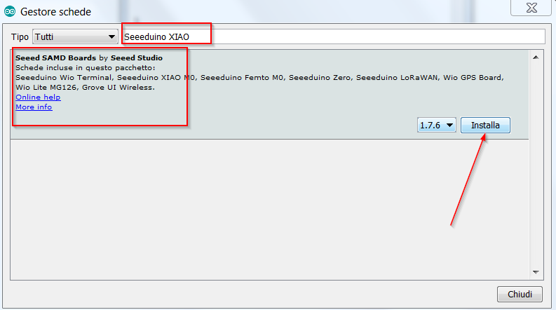 Viene identificata la scheda “Seeed SAMD Boards”. Si installa con il pulsante “Installa”.
