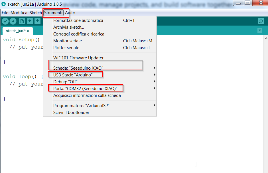 Si impostano i seguenti parametri per la scheda Seeeduino XIAO dal menù Strumenti